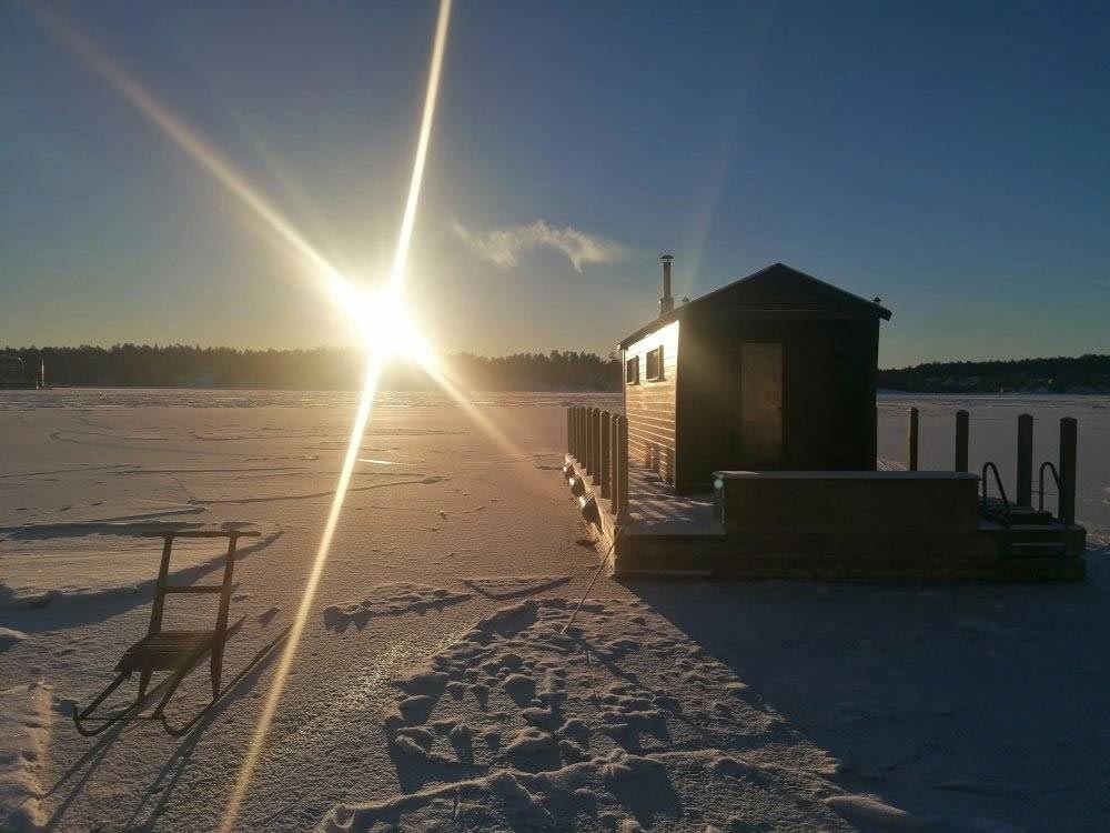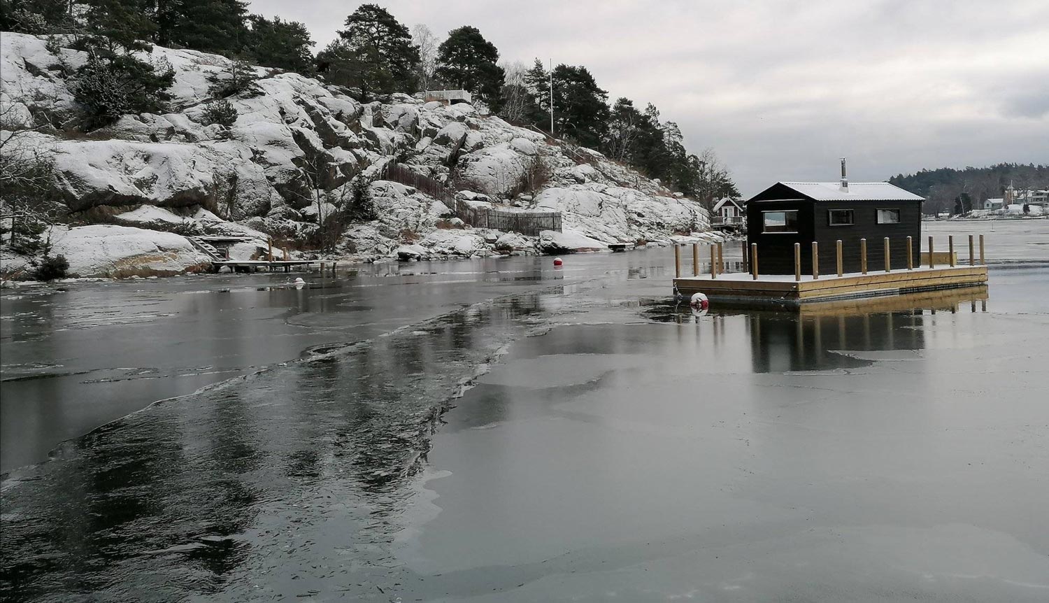 Mitt i Stockholms skärgård, bara ett stenkast från Vaxholm, ligger en svajande bastuflotte—vedeldad, rustik och öppen för bokning året om.